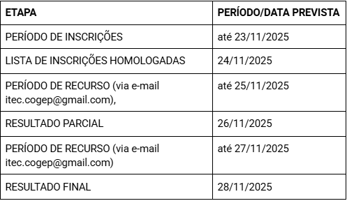 A realização das etapas do presente cronograma do processo seletivo poderá sofrer prorrogações, suspensões ou até mesmo cancelamentos, a critério da Coordenação de Gestão de Pessoas. Contudo, caso ocorra, será comunicado através do site da unidade: itecfurg.org