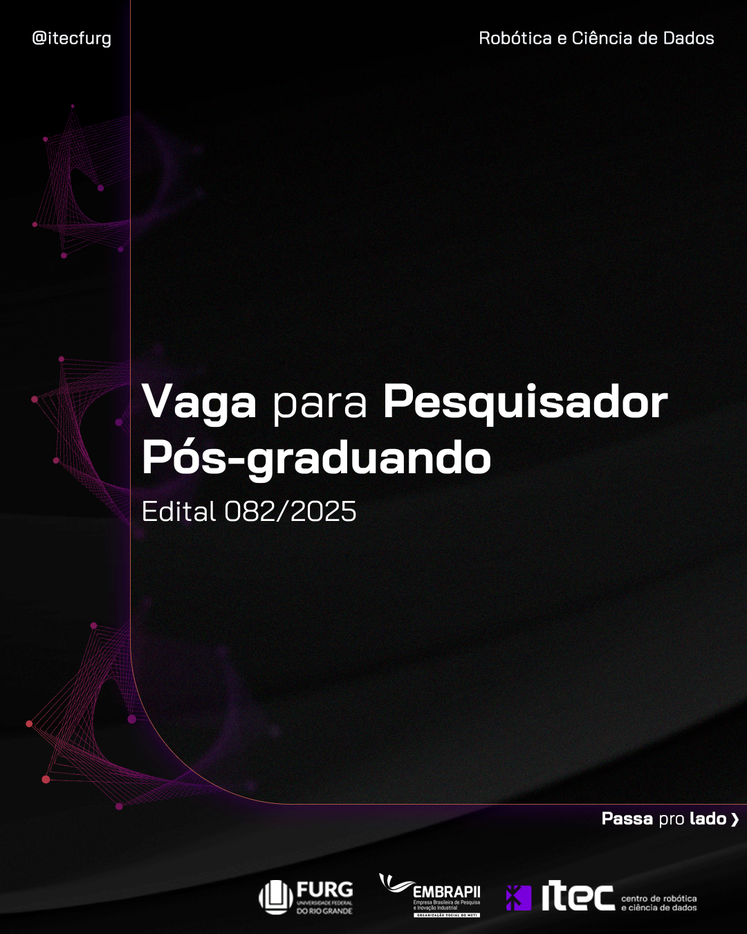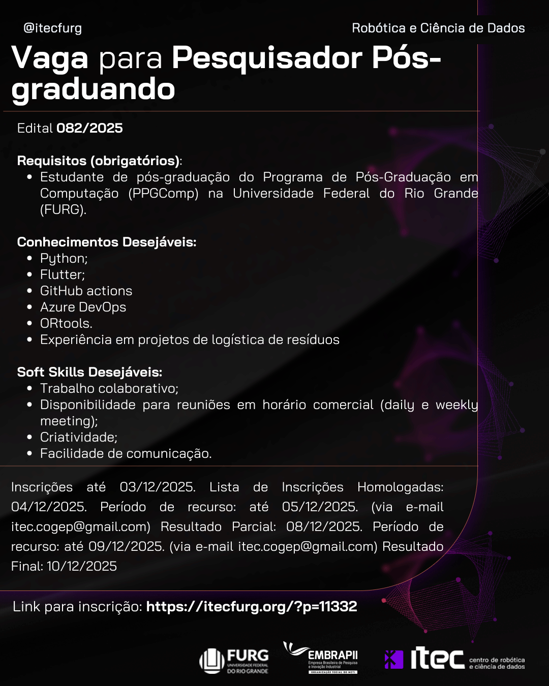A Direção do ITEC – Centro de Robótica e Ciência de Dados da Universidade Federal do Rio Grande – FURG, no uso de suas atribuições, torna público o Edital 082/2025 – vaga para para Pesquisador Pós-graduando, para atuar como bolsista, nos termos do presente Edital.