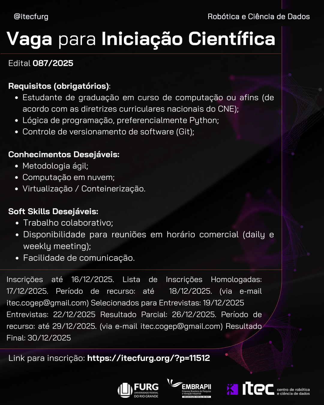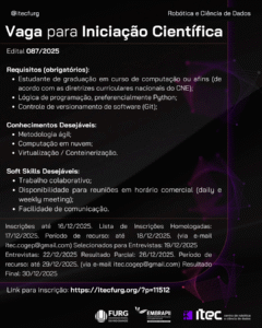 A Direção do ITEC – Centro de Robótica e Ciência de Dados da Universidade Federal do Rio Grande – FURG, no uso de suas atribuições, torna público o Edital 087/2025 – vaga para para iniciação científica, para atuar como bolsista, nos termos do presente Edital.