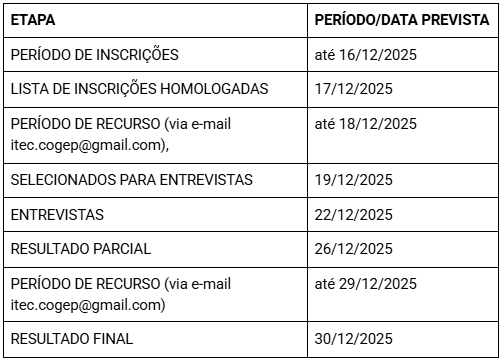 - A divulgação dos selecionados para a etapa da entrevista está prevista para o dia 22/12/2025 e será feita no site da unidade iTec/FURG (http://itecfurg.org/), sendo o contato para agendamento da entrevista feito por e-mail.