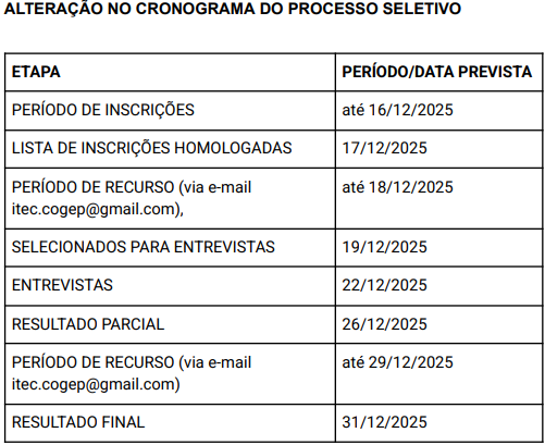 A realização das etapas do presente cronograma do processo seletivo poderá sofrer prorrogações, suspensões ou até mesmo cancelamentos, a critério da Coordenação de Gestão de Pessoas. Contudo, caso ocorra, será comunicado através do site da unidade: itecfurg.org
