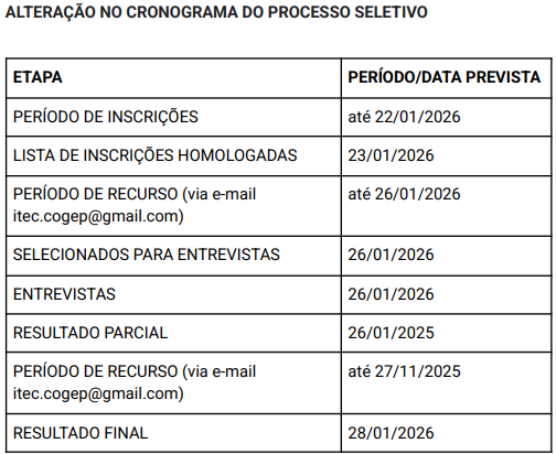 A realização das etapas do presente cronograma do processo seletivo poderá sofrer prorrogações, suspensões ou até mesmo cancelamentos, a critério da Coordenação de Gestão de Pessoas. Contudo, caso ocorra, será comunicado através do site da unidade: itecfurg.org