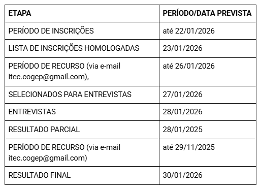 - A divulgação dos selecionados para a etapa da entrevista está prevista para o dia 27/01/2026 e será feita no site da unidade iTec/FURG (http://itecfurg.org/), sendo o contato para agendamento da entrevista feito por e-mail.