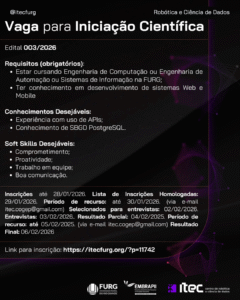 A Direção do ITEC – Centro de Robótica e Ciência de Dados da Universidade Federal do Rio Grande – FURG, no uso de suas atribuições, torna público o Edital 003/2026 – vaga para para iniciação científica, para atuar como bolsista, nos termos do presente Edital.