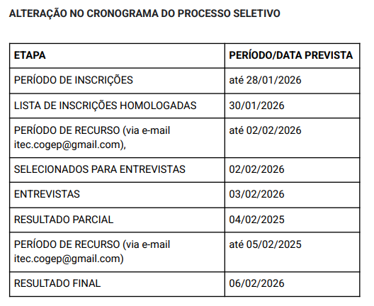 A realização das etapas do presente cronograma do processo seletivo poderá sofrer prorrogações, suspensões ou até mesmo cancelamentos, a critério da Coordenação de Gestão de Pessoas. Contudo, caso ocorra, será comunicado através do site da unidade: itecfurg.org