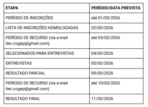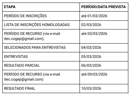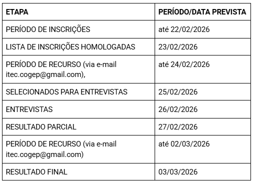 - A divulgação dos selecionados para a etapa da entrevista está prevista para o dia 18/02/2026 e será feita no site da unidade iTec/FURG (http://itecfurg.org/), sendo o contato para agendamento da entrevista feito por e-mail.