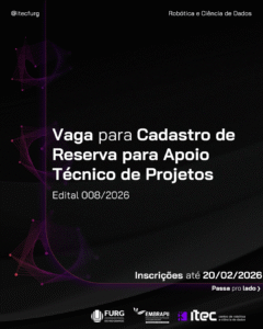 A Direção do ITEC – Centro de Robótica e Ciência de Dados da Universidade Federal do Rio Grande – FURG, no uso de suas atribuições, torna público o Edital 008/2026 – vaga para para cadastro reserva de apoio técnico de projetos, nos termos do presente Edital.