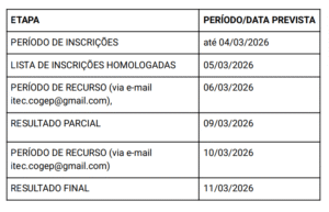A realização das etapas do presente cronograma do processo seletivo poderá sofrer prorrogações, suspensões ou até mesmo cancelamentos, a critério da Coordenação de Gestão de Pessoas. Contudo, caso ocorra, será comunicado através do site da unidade: itecfurg.org
