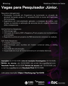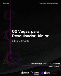 A Direção do ITEC – Centro de Robótica e Ciência de Dados da Universidade Federal do Rio Grande – FURG, no uso de suas atribuições, torna público o Edital 016/2026 – vaga para pesquisador externo – PETROBRAS, para atuar como bolsista, nos termos do presente Edital.