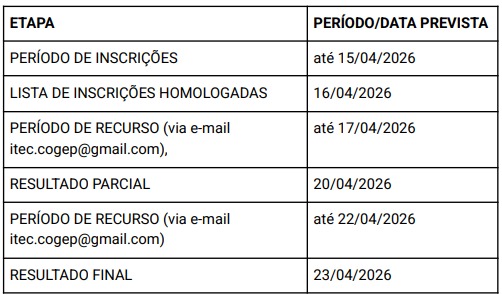 CRONOGRAMA DO PROCESSO SELETIVO: A realização das etapas do presente cronograma do processo seletivo poderá sofrer prorrogações, suspensões ou até mesmo cancelamentos, a critério da Coordenação de Gestão de Pessoas. Contudo, caso ocorra, será comunicado através do site da unidade: itecfurg.org