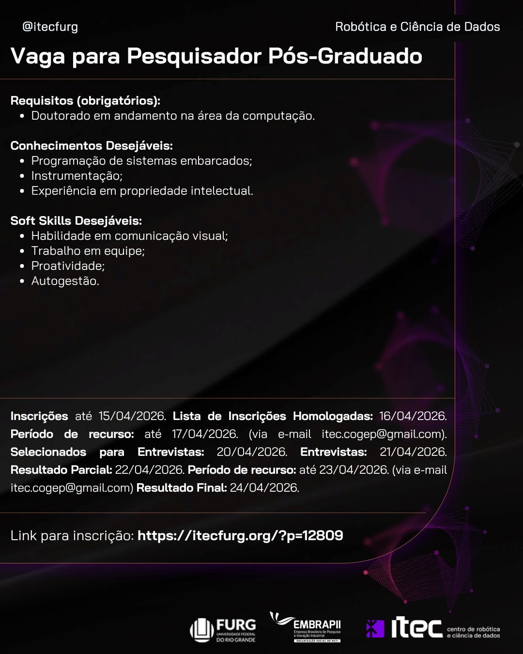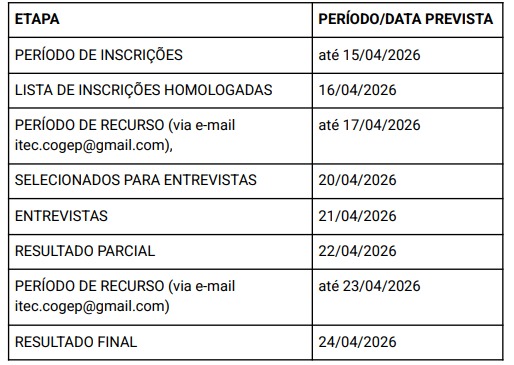 A divulgação dos selecionados para a etapa da entrevista está prevista para o dia 20/04/2026 e será feita no site da unidade iTec/FURG (http://itecfurg.org/), sendo ocontato para agendamento da entrevista feito por e-mail.