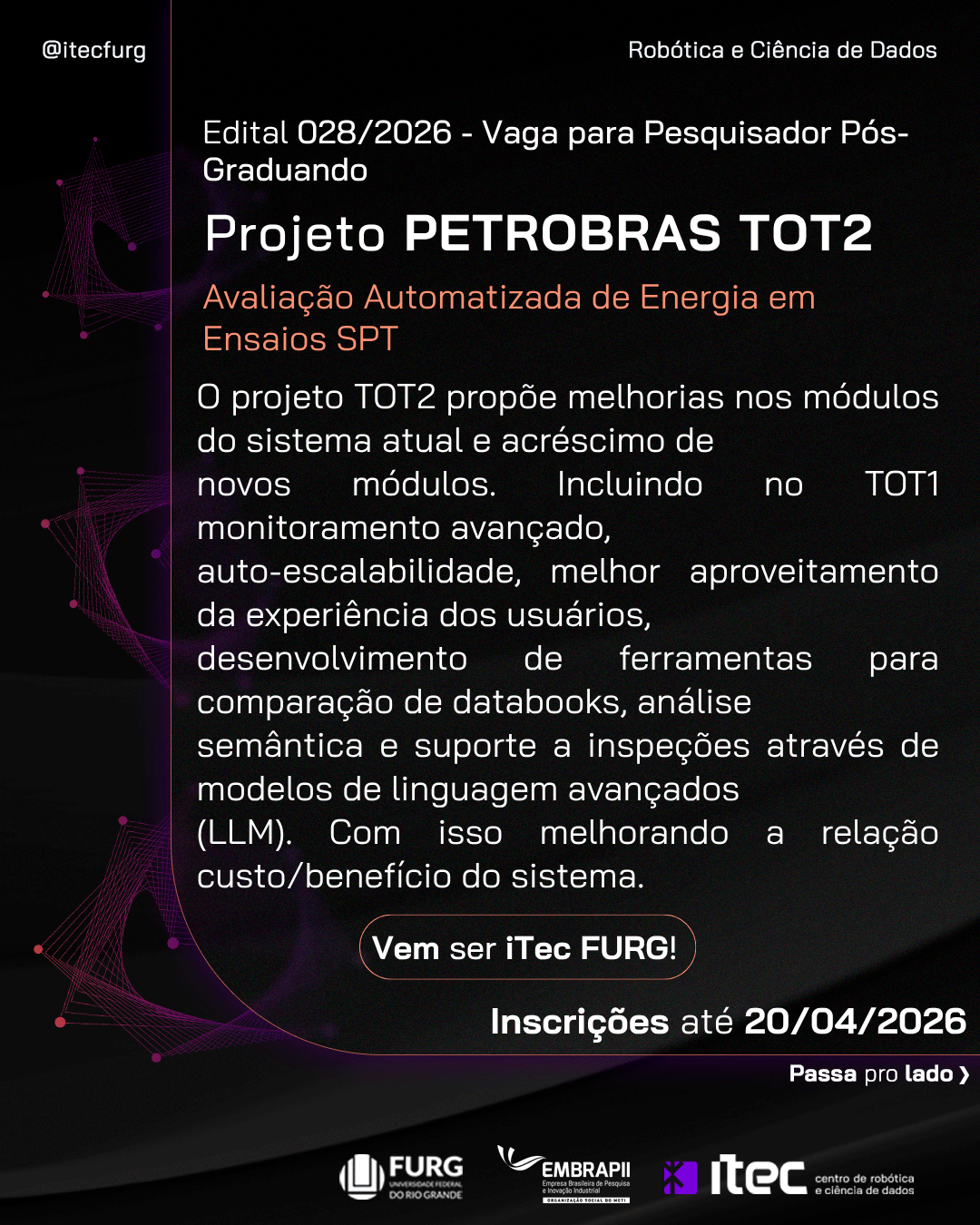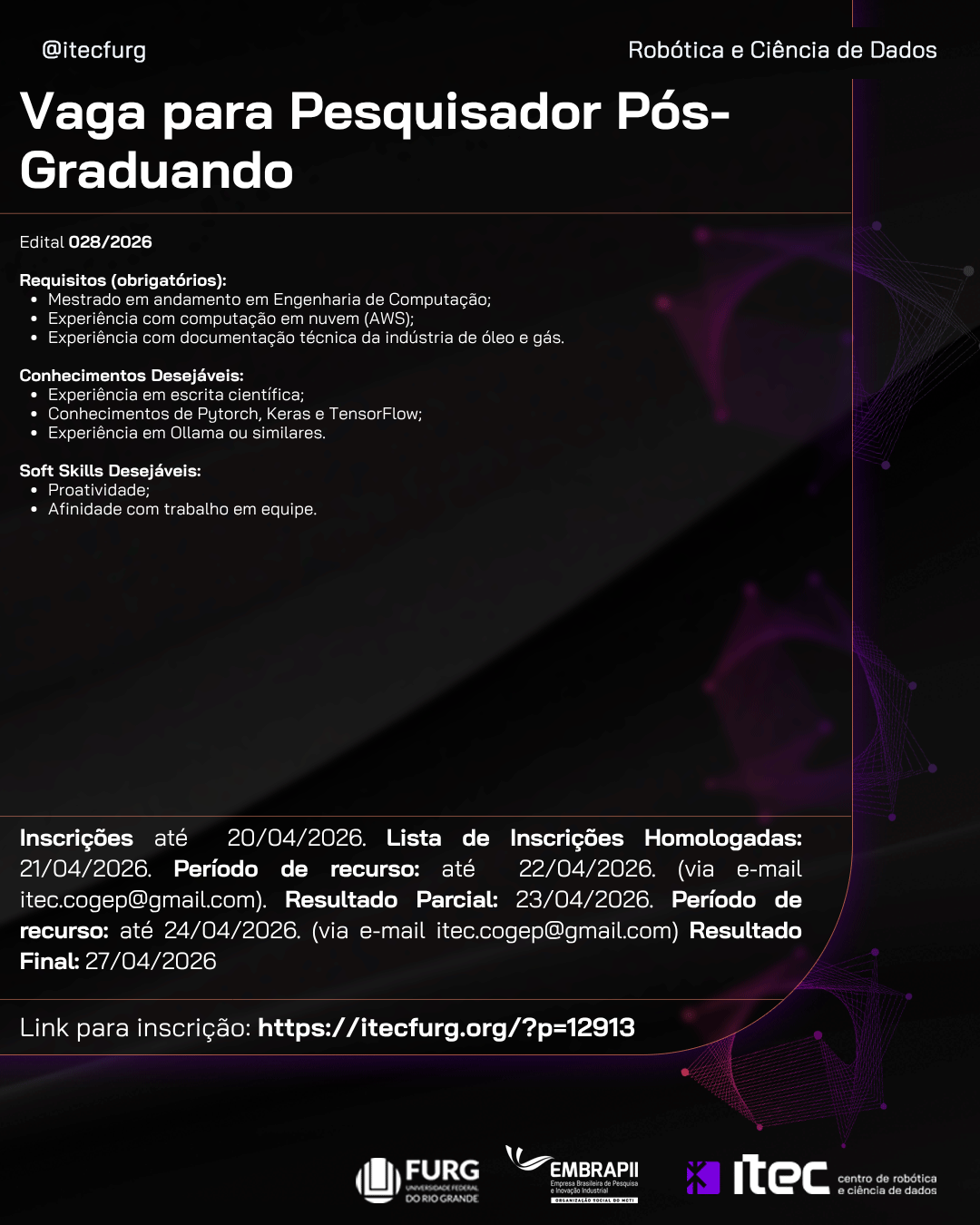 Edital 028/2026 – PETROBRAS 01 vaga para Pesquisador Pós-Graduando Inscrições até 20/04/2026 Valor da bolsa por projeto – R$2.996,00 CH: 20h (semanais)