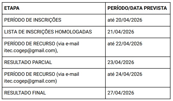 CRONOGRAMA DO PROCESSO SELETIVO: A realização das etapas do presente cronograma do processo seletivo poderá sofrer prorrogações, suspensões ou até mesmo cancelamentos, a critério da Coordenação de Gestão de Pessoas. Contudo, caso ocorra, será comunicado através do site da unidade: itecfurg.org